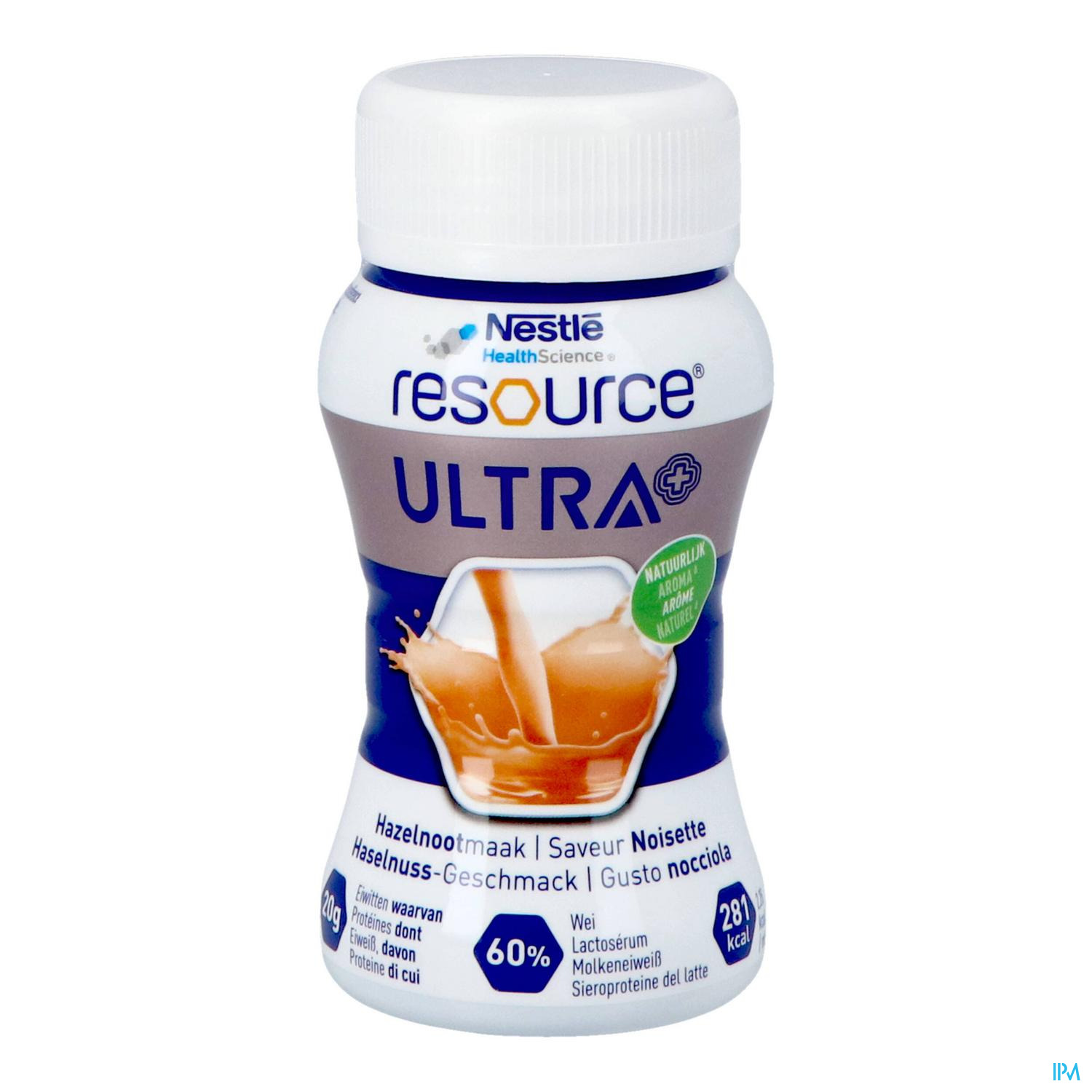 Resource Ultra+ is een eiwit‐ en energierijke voeding. Een flesje van 125ml bevat 20 g wei‐eiwitten (28% kcal) en 281 kcal (2,25 kcal/ml). Voeding voor medisch gebruik bij ondervoeding of risico op ondervoeding bij volwassenen.